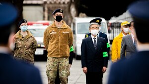 Service members, community members, and Misawa City police officers stand in formation during the End-of-Year Traffic Safety and Crime Prevention Campaign in Misawa City, Japan, Dec. 16, 2021. During the campaign, 35th Fighter Wing, Misawa City and police leadership distributed flyerss with