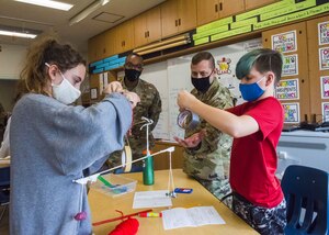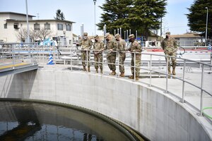 U.S. Air Force Col. Jesse Friedel, left, Misawa Air Base installation commander, and U.S. Navy Capt. Brian Pummill, right, Naval Air Facility Misawa commanding officer, greet Takashi Uto, Japan State Minister of Foreign Affairs, at Misawa Air Base, Japan, April 12, 2021. Uto visited the base to meet