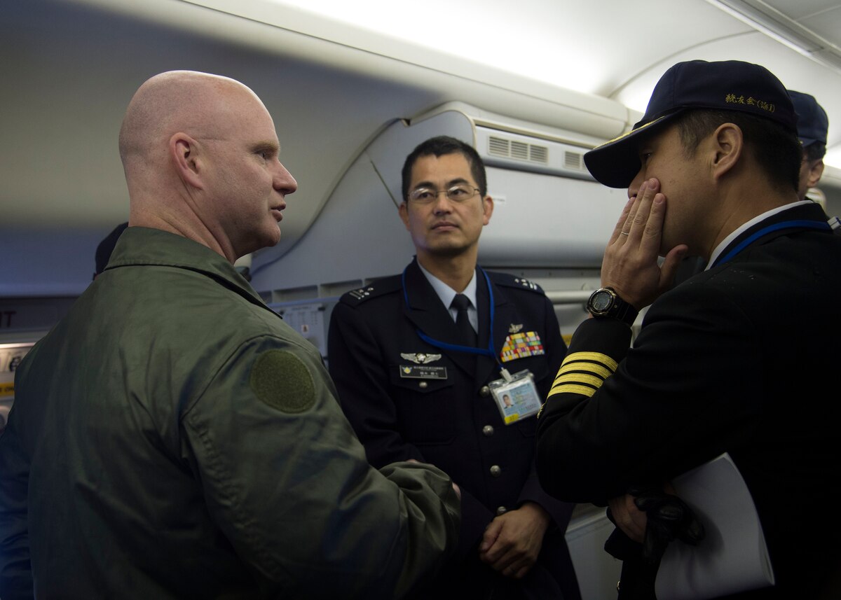 U.S. Navy Lt. Shaun Randall, the Naval Air Facility Misawa VAQ-135 training officer, briefs Japanese and Republic of Korea colonels and lieutenant colonels on the mission and capabilities of the EA-18G Growler at Misawa Air Base, Japan, Dec. 13, 2016. In addition to seeing the EA-18G, Japanese and Republic of Korea leaders listened to a mission brief on the F-16 Fighting Falcon and the Air Force’s presence in Misawa. (U.S. Air Force photo by Senior Airman Deana Heitzman)