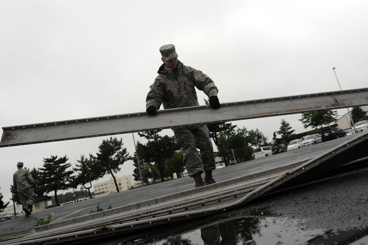 U.S. Air Force Senior Airmen Travis Stout, right, and Nicholas Ellis, 35th Civil Engineer Squadron structural journeymen, move scrap metal onto a forklift at Misawa Air Base, Japan, June 27, 2013. The metal was scrap from a mezzanine project they had previously finished. The scrap metal is taken to Defense Logistics Agency Disposition Services where they decide if it can be re-used for another project. (U.S. Air Force photo by Airman 1st Class Kia Atkins)