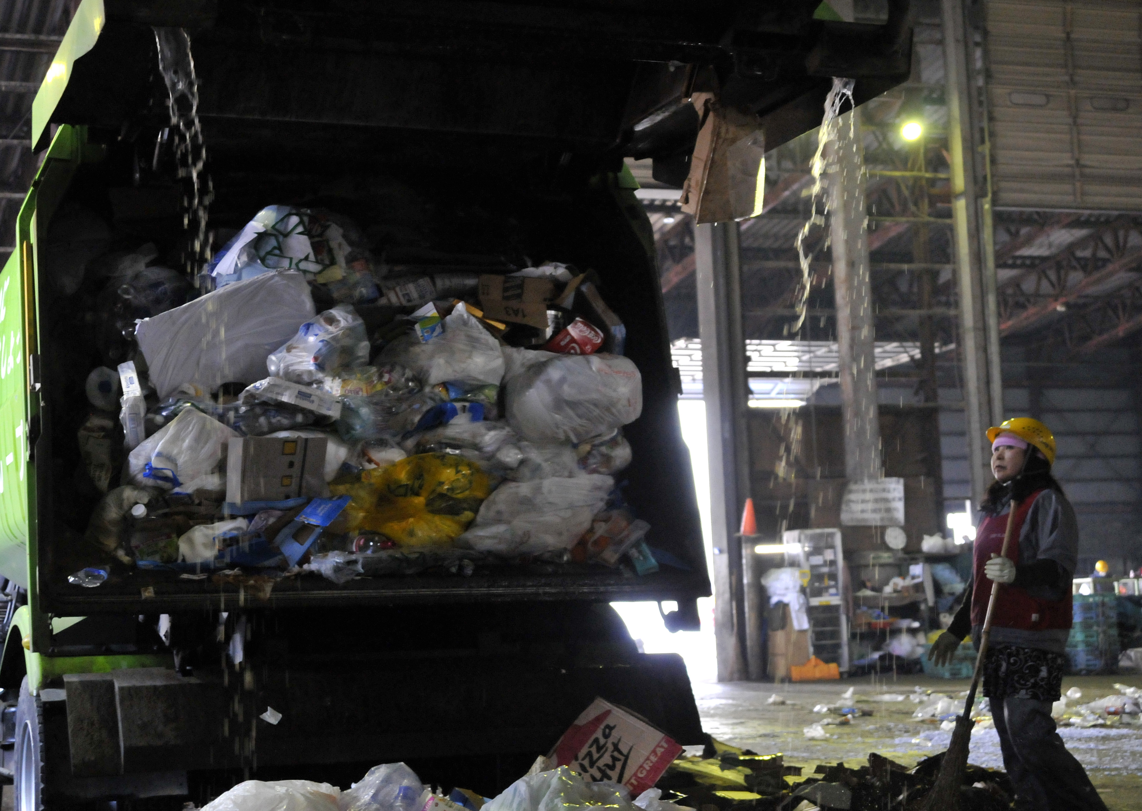 Haruhito Ishixuka, Hosoya Disposal Site Misawa Air Base trash manager, right, points at a metal bucket found in a bulk trash delivery as Hajime Sasaki, 35th Civil Engineer Squadron solid waste manager, looks on in Misawa City, Japan, Feb. 28, 2013. The chief complaint of the Hosoya Disoposal Site is recyclables being mixed with bulk waste. Hosoya is the final stop for all of the base’s trash and recyclables. (U.S. Air Force photo by Tech. Sgt. Phillip Butterfield)
