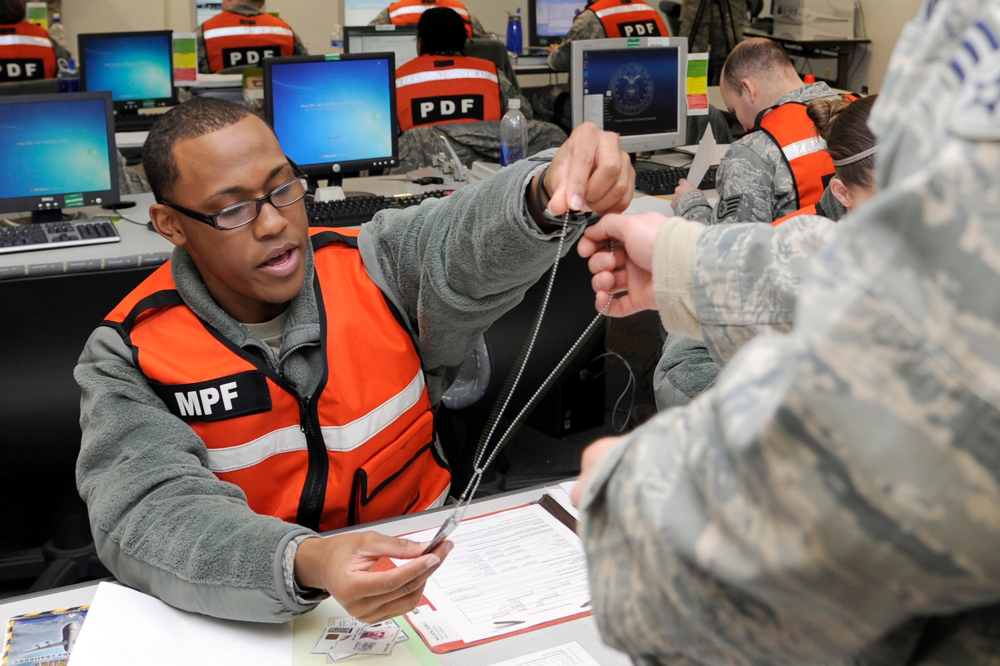 Senior Airman Dominique Barrett, left, 35th Force Support Squadron, inspects dog tags from Airman 1st Class Alexander Phillips, 35th Maintenance Squadron, during the personnel deployment function line portion of an operational readiness inspection at MIsawa Air Base, Japan, Dec. 5, 2011. The Pacific Air Forces Inspector General team is in town to evaluate the airmen of the 35th Fighter Wing and their ability to deploy. (U.S. Air Force photo/Tech. Sgt. Marie Brown)