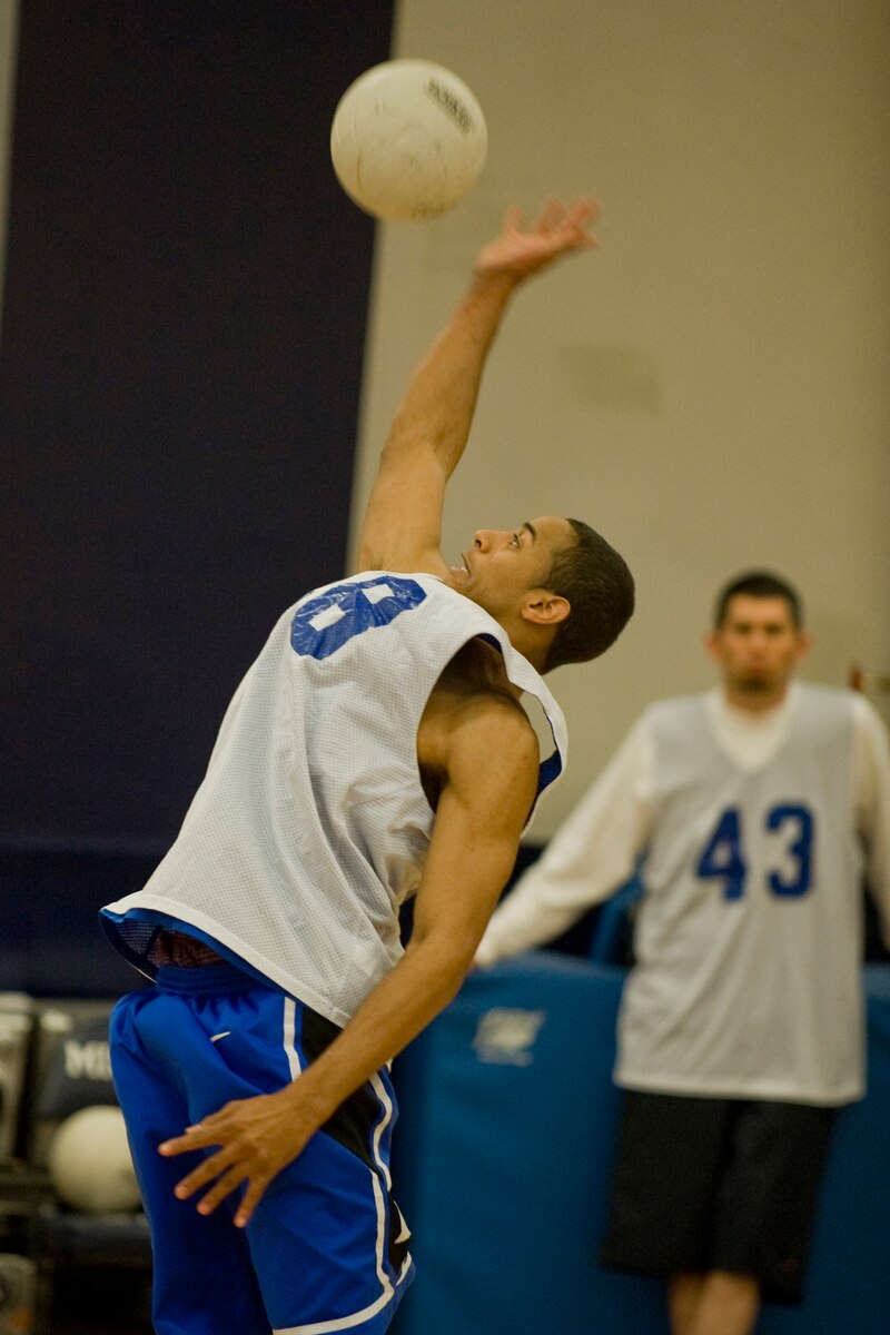 MISAWA AIR BASE, Japan -- Airman 1st Class Sydney Sullivan, of the 35th Force Support Squadron, readies a spike against Staff Sgt. Jeff Gall, of the 35th Communications Squadron, during an intramural volleyball game March 29 at the Potter Fitness Center. 35th FSS squeaked past 35th CS, winning two of the three sets played. (U.S. Air Force photo/Senior Airman Jamal D. Sutter)