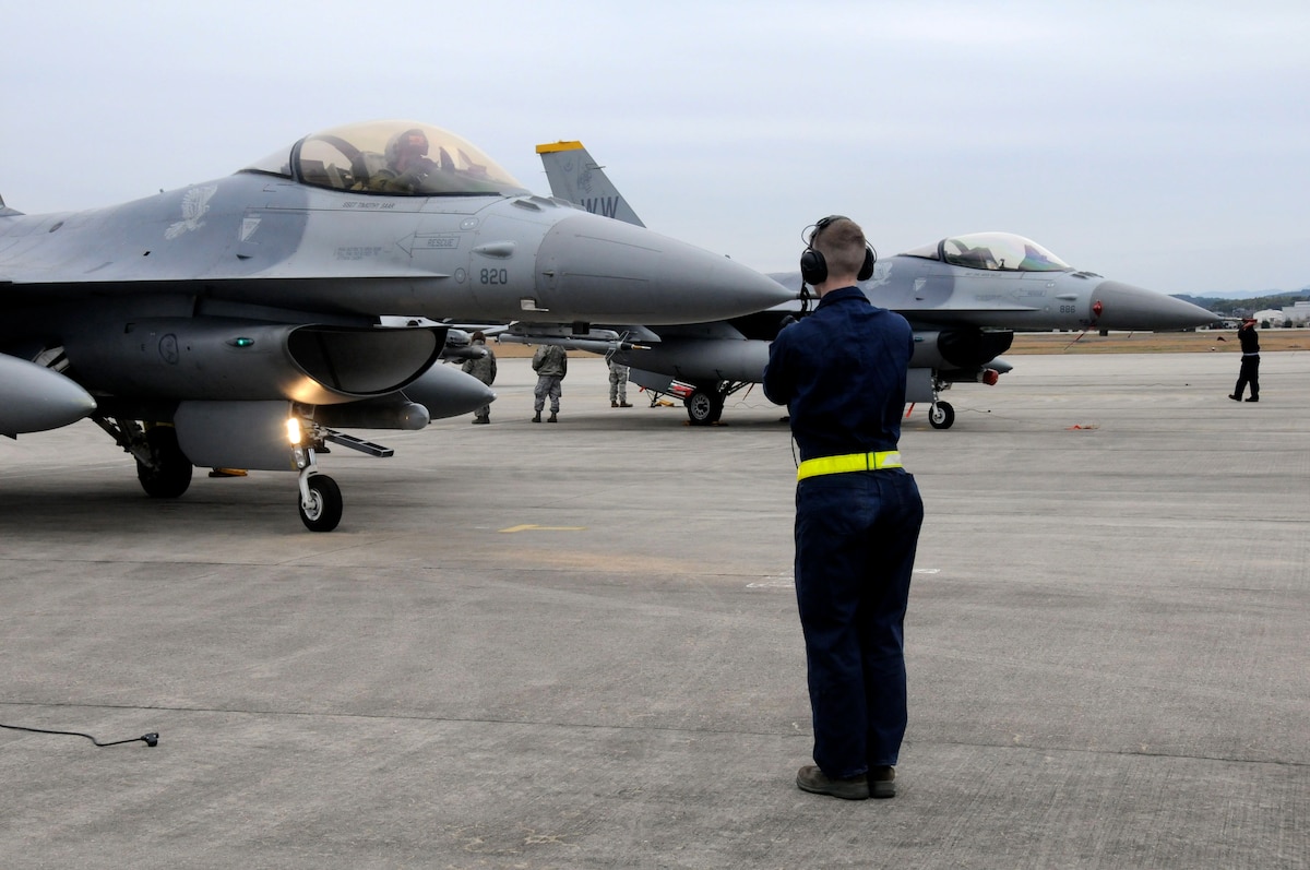TSUIKI AIR BASE, Japan -- Capt. Eric Boyes, 14th Fighter Squadron pilot, hands his gear to Staff Sgt. Mario Almaraz, 35th Aircraft Maintenance Squadron crewchief, following an air-to-air training mission with Japan Air Self-Defense Force F-2s and F-15s March 8. The training is part of a week-long aviation training relocation exercise. (U.S. Air Force photo/Staff Sgt. Rachel Martinez)