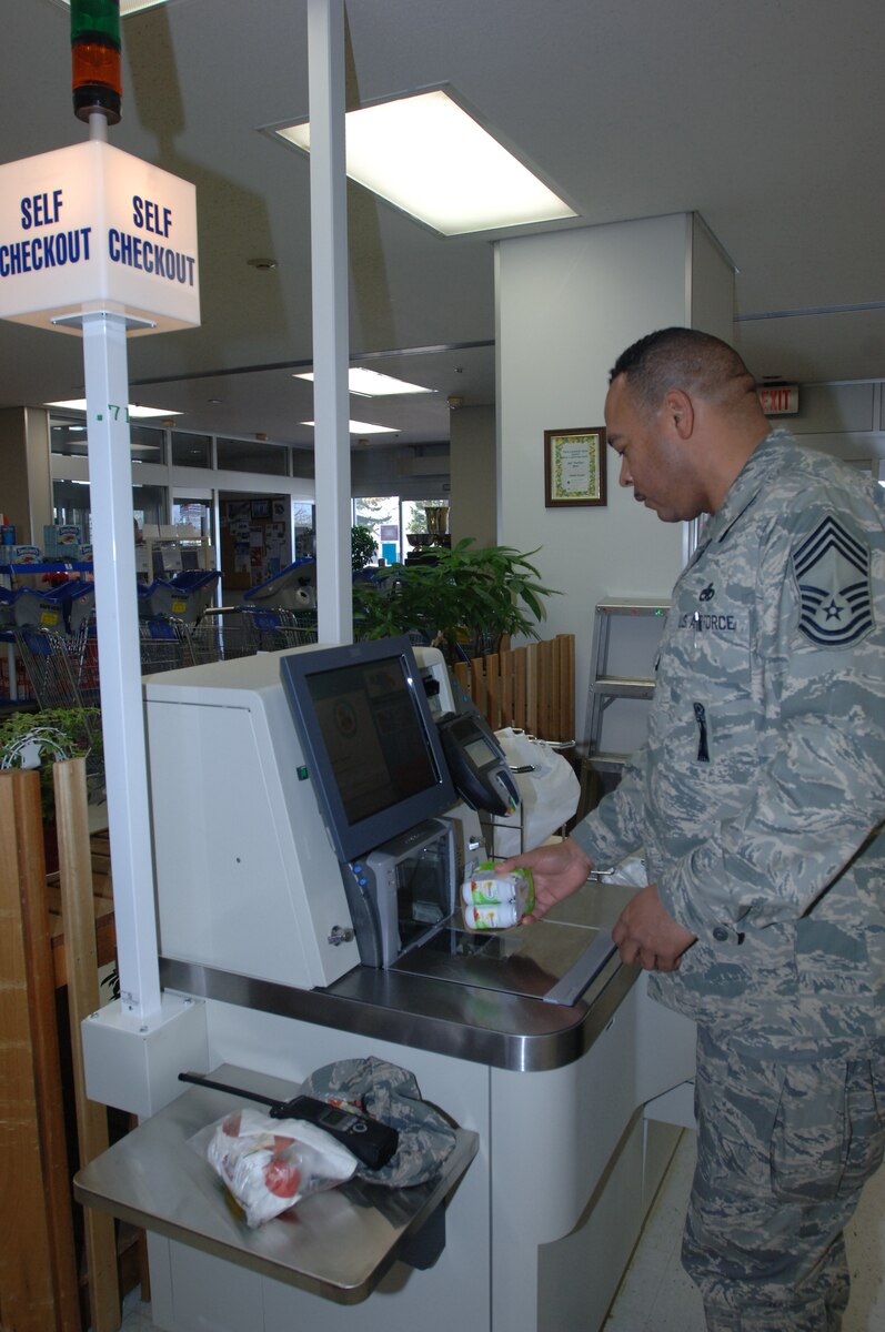 MISAWA AIR BASE, Japan -- Staff Sgt. Misty Delisle, 35th Fighter Wing Protocol, is shown how to use the new self-help check out machines at the base commissary Mar. 12, 2008. In addition to the self-checkout registers, the commissary has installed new state-of-the-art registers that will reduce the time customers wait in line. (U.S. Air Force photo by Senior Airman Robert Barnett)
