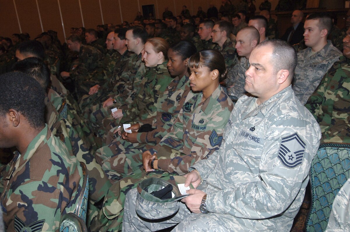 MISAWA AIR BASE, Japan -- Chief Master Sgt. Ricky Price, 35th Fighter Wing command chief, and Col. T.J. O'Shaughnessy, 35th Fighter Wing commander, address Misawa members on unwavering professionalism during a commander's call at the enlisted club Feb. 22, 2008. The commander's call was part of U.S. Forces Japan's "Day of Reflection." (U.S. Air Force photo by Senior Airman Robert Barnett)