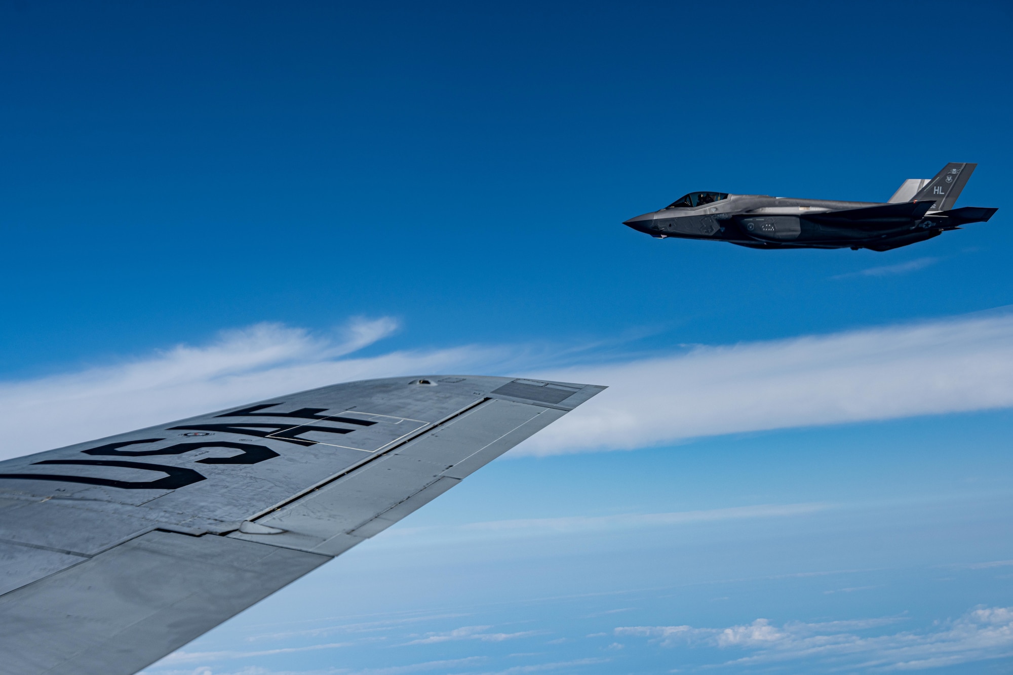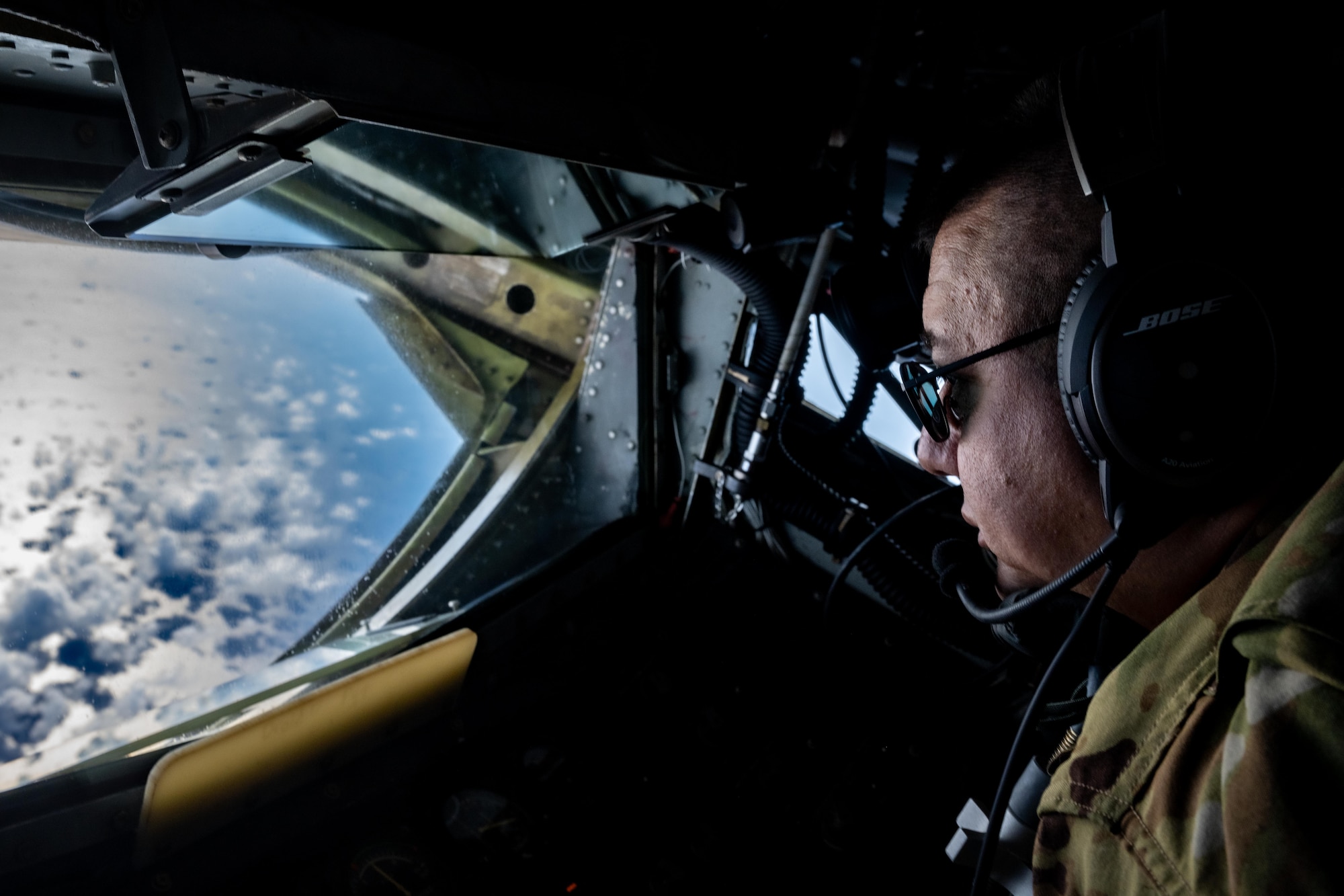 U.S. Air Force Staff Sgt. Jordan Barker, 909th Air Refueling Squadron (ARS) boom operator, operates a refueling boom of a KC-135 Stratotanker assigned to the 909th ARS during a refueling mission in preparation of Exercise Bushido Guardian 2025 over the Pacific Ocean near Misawa Air Base, Japan, Sept. 26, 2025. Such missions demonstrate the seamless partnership between allies, guaranteeing airpower projection and strategic deterrence against evolving threats. (U.S. Air Force photo by Airman Hannah Bench)