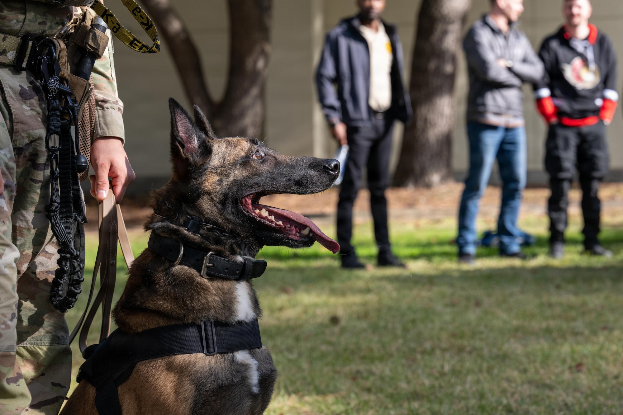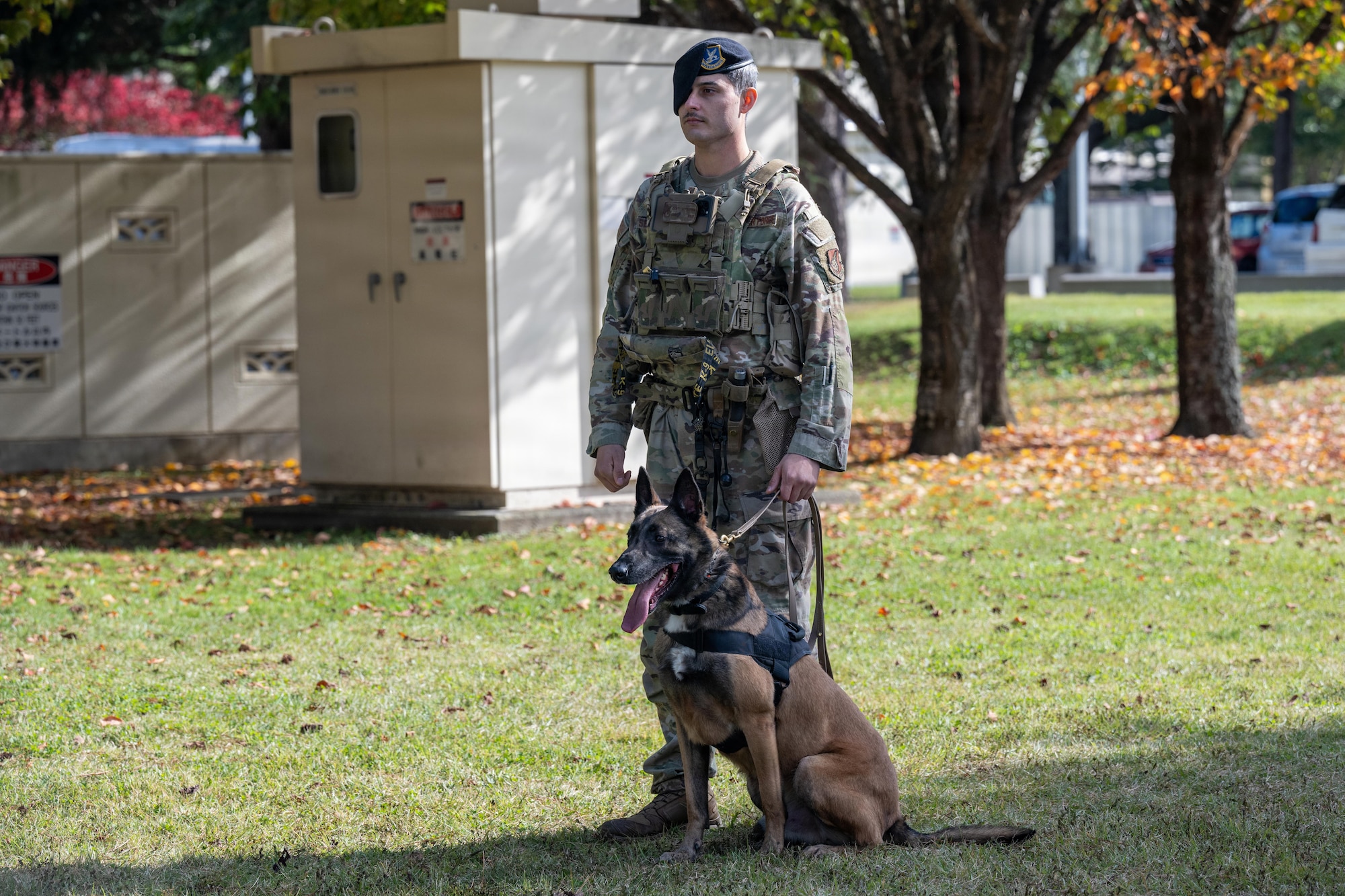 U.S. Air Force Staff Sgt. Dante Sepulveda, 35th Security Forces Squadron (SFS) military working dog (MWD) trainer, showcases the training of Clinton, 35th SFS MWD, as part of a demonstration during a joint special weapons and tactics training event at Misawa Air Base, Japan, Oct. 24, 2025. The K-9 demonstration showcased advanced detection and apprehension techniques, highlighting how teamwork between handlers and military working dogs strengthens the 35th Fighter Wing’s security posture. (U.S. Air Force photo by Airman Hannah Bench)
