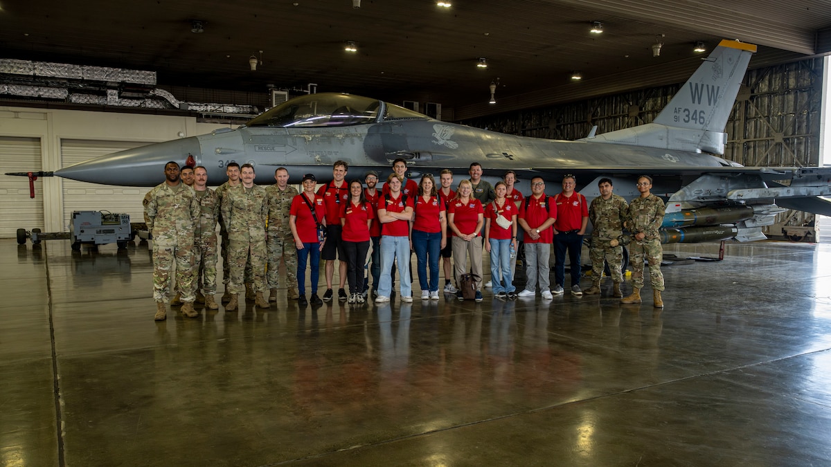 Members of the Wenatchee Valley, Washington sister city delegation look at F-16 Fighting Falcon munitions while their function is explained by members of the 35th Maintenance Group at Misawa Air Base, Japan, Oct. 3, 2025. Delegates from Wenatchee visit Misawa City annually, highlighting the legacy of community relations initiated by the historic Miss Veedol flight in 1931, the first non-stop flight across the Pacific Ocean starting at Sabishiro Beach, Misawa and landing in East Wenatchee. (U.S. Air Force photo by Senior Airman Patrick Boyle)