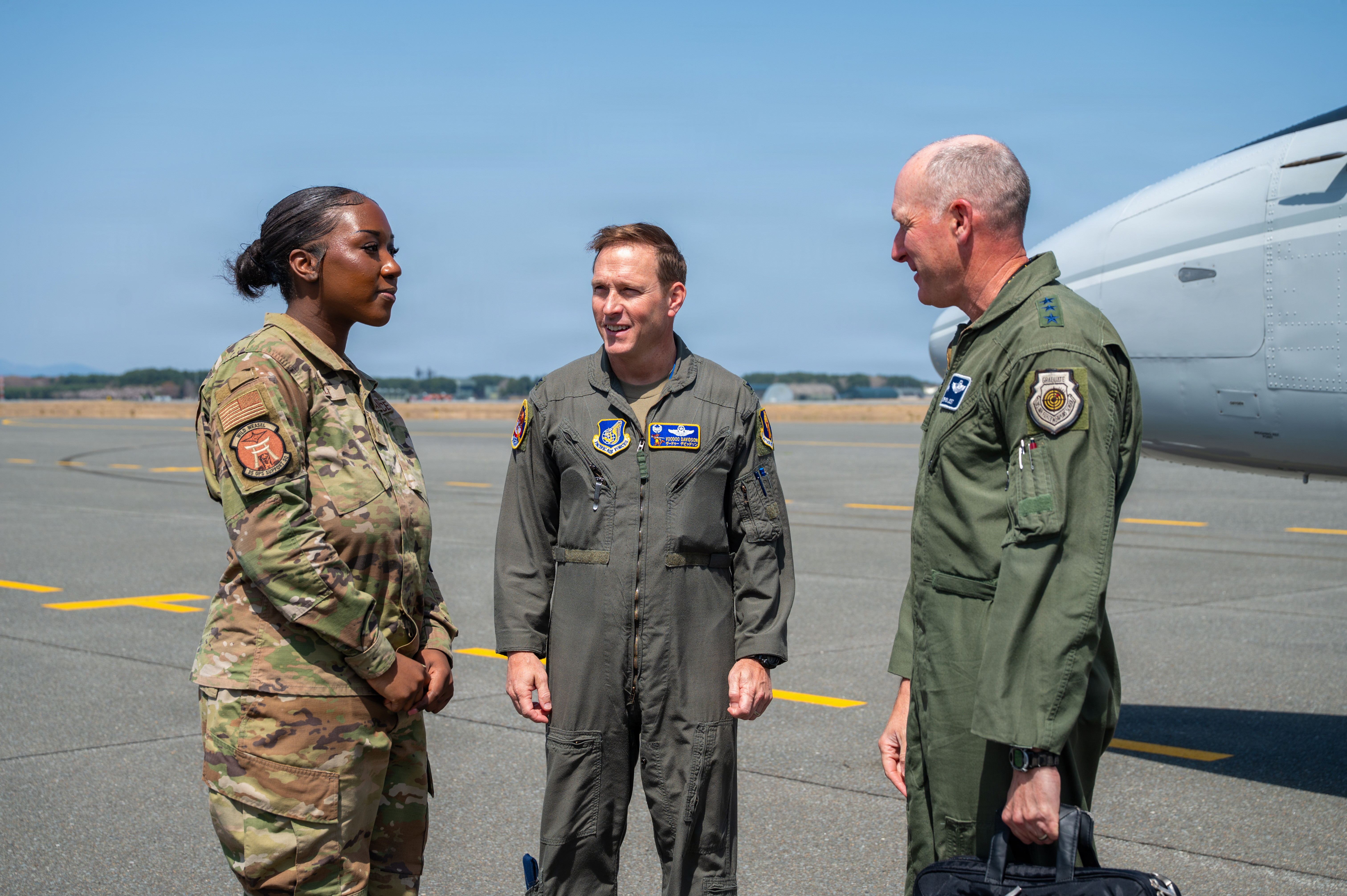 U.S. Air Force Senior Airman Jarese Wilson, 35th Operations Support Squadron airfield management shift lead, provides an overview of her responsibilities to Col. Paul Davison, commander of the 35th Fighter Wing (FW), and Chief Master Sgt. David Najera, 35th FW command chief, at Misawa Air Base, Japan, April 20, 2026. Airfield management personnel are responsible for coordinating airfield operations, ensuring safe aircraft movement, and maintaining the overall efficiency of the installation’s flightline, which is critical to supporting timely and effective mission execution. (U.S. Air Force photo by Airman 1st Class Angelica Winther)