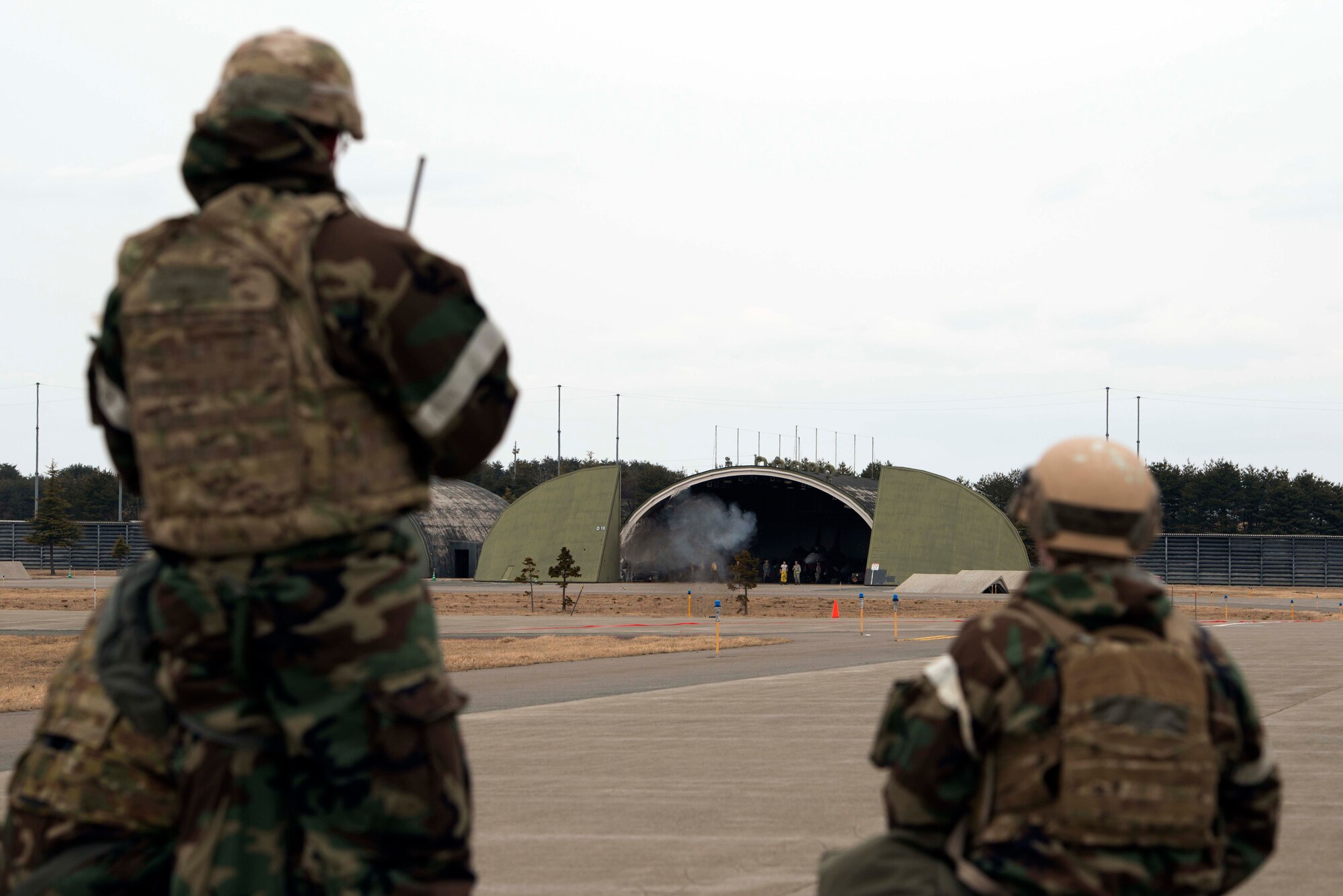 Staff Sgt. Matthew Morris, right, 35th Civil Engineer Squadron Explosive Ordnance Disposal technician, identifies a detonation location to Airman 1st Class Thomas Cuff, 35 CES EOD tech, during an operational readiness exercise March 3, 2015, at Misawa Air Base, Japan. The EOD team is the only qualified team on base to dispose of unexploded ordnance. (U.S. Air Force photo by Staff Sgt. Derek VanHorn)