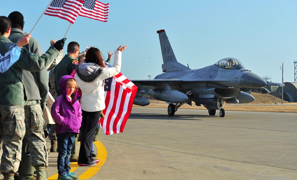 An F-16 Fighting Falcon pilot from the 13th Fighter Squadron raises his hand in the form of a panther claw, the squadron signature gesture, at family members and friends as he readies for departure at Misawa Air Base, Japan, April 8, 2014. Members of his squadron, along with family and friends, had the opportunity to wave their last goodbyes to the team of Wild Weasels headed for deployment abroad. (U.S. Air Force photo/Senior Airman Jose L. Hernandez-Domitilo)
