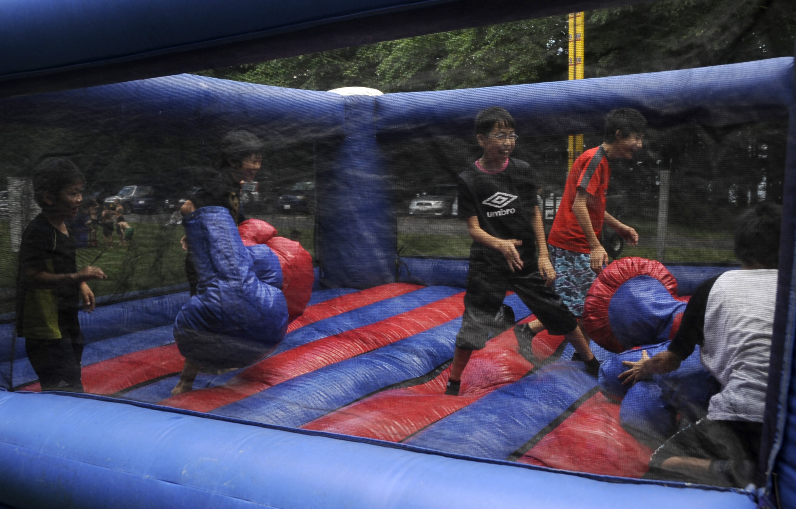 Children from the Fuji Seiboen orphanage attending the 35th Logistics Readiness Squadron picnic play on a bouncy castle at Misawa Air Base, Japan, Aug. 24, 2013. The orphanage has children varying from two to 18 years old, and about 80 children are expected each year along with their adult chaperones to attend the picnic. (U.S. Air Force photo by Airman 1st Class Kaleb Snay)