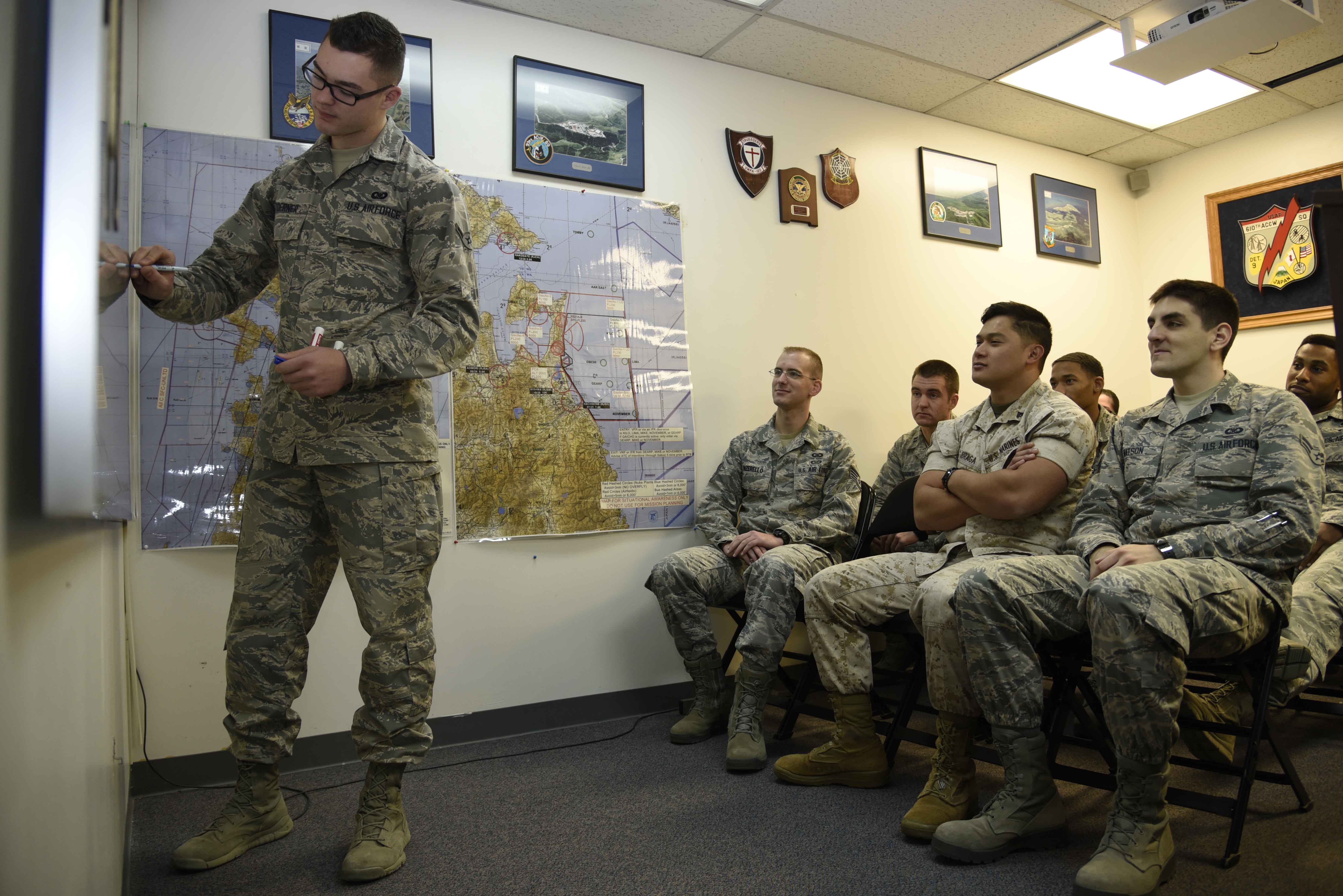 U.S. Air Force Airman Ryan Toerner, 610 Air Control Flight weapons director technician, briefs Airmen at Misawa Air Base, Japan, Oct. 29, 2015. These briefings are done to inform four to 12 people of the Suppression of Enemy Air Defenses mission. (U.S. Air Force photo by Airman 1st Class Jordyn Fetter/Released)