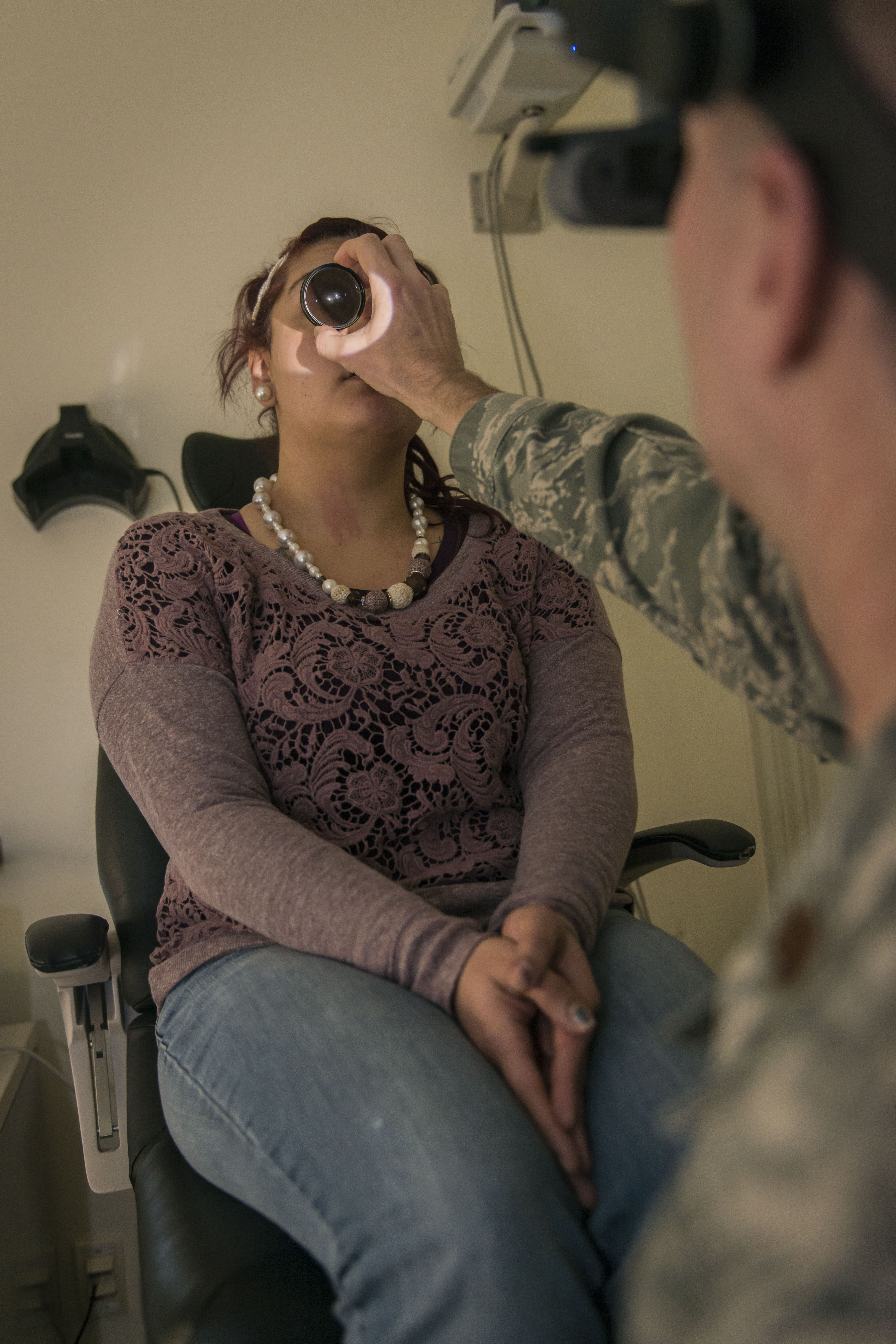 U.S. Air Force Maj. Ronny Bowman, an optometric physician with the 35th Aerospace Medicine Squadron, peers into the eyes of Tina Rueb, a child youth program assistant with the Lunney Youth Center, at Misawa Air Base, Japan, Jan. 21, 2016. Routine eye exams are much more than the simple vision screening test conducted by a patient’s primary care manager and are conducted every year or as needed for active duty service members to maintain fitness for duty. Exams are conducted once a year for active duty family members and every two years for all other TRICARE Prime beneficiaries. Bowman hails from Paris, Arkansas, and Reub is a Clovis, New Mexico, native. (U.S. Air Force photo by Staff Sgt. Benjamin W. Stratton)